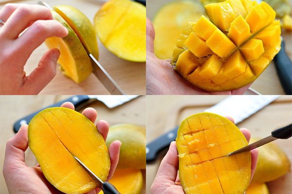 Dùng dao cắt 2 bên má nhiều thịt, chú ý cắt sát hạt để lấy được nhiều phần thịt xoài hơn. Các bạn lấy mũi dao khứa hình caro trên các miếng xoài vừa cắt để chuẩn bị xay.