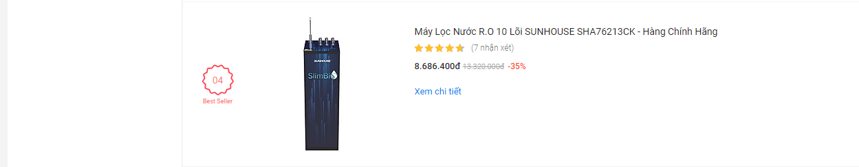 Máy lọc nước SHA76213CK-S lọt top 5 sản phẩm bán chạy trên Tiki
