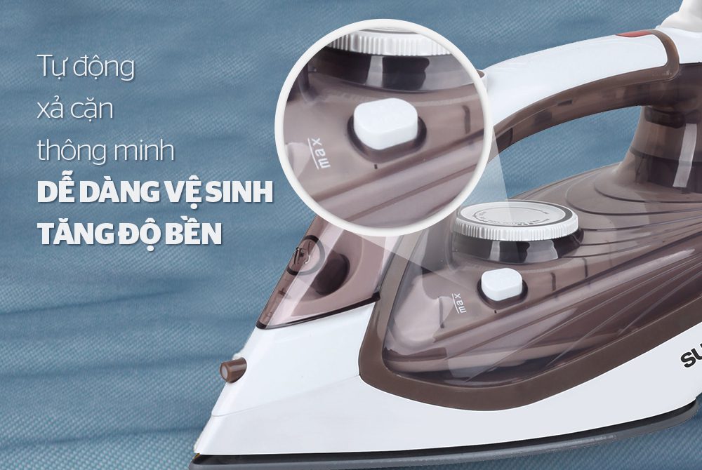 Bàn là hơi CHÍNH HÃNG SUNHOUSE SHD2066 được trang bị chức năng tự động xả cặn thông minh. Khi thường xuyên sử dụng bàn là, phần bình chứa nước sẽ dễ dàng bị tích cặn bẩn. Để làm sạch, bạn chỉ cần tiếp đầy nước cho bình chứa trong bàn là, chọn chế độ nhiệt cao nhất. Sau khi bàn là đã nóng và đèn báo tắt, bạn nhấn và giữ Nút xả cặn, đồng thời lắc nhẹ bàn là hơi. Lúc này hơi nước và nước nóng sẽ thoát ra từ mặt đế bàn là, các tạp chất và cặn bẩn (nếu có) sẽ được xả theo ra ngoài.