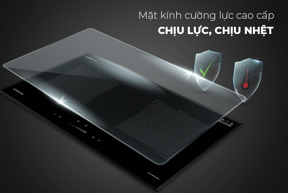 Mặt bếp làm bằng kính cao cấp, vát cạnh, dày 4mm, chịu lực, chịu nhiệt tốt và có độ bền vượt trội. Đặc biệt, bề mặt bếp sáng bóng, nhẵn mịn nên rất sang trọng và dễ dàng vệ sinh sau khi sử dụng.