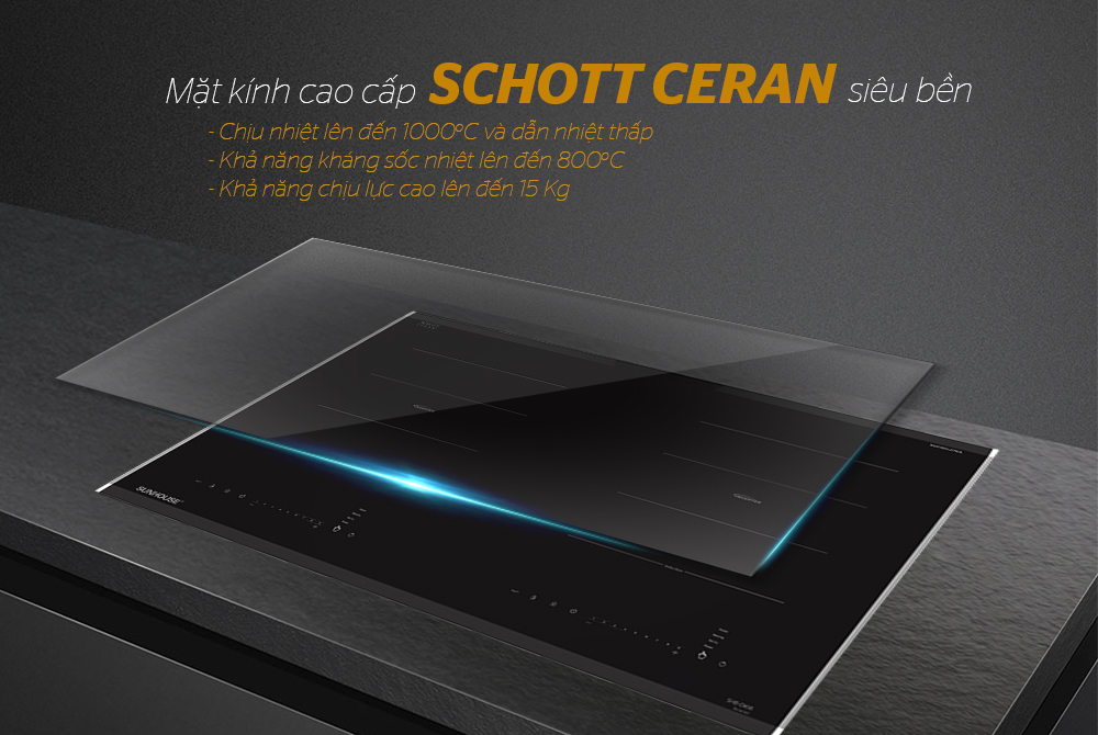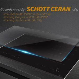 SHB DI66 sử dụng mặt kính Schott Ceran vát cạnh tinh tế. Đây là loại kính cao cấp, làm từ gốm sứ thủy tinh đặc biệt, siêu cứng, siêu bền, độ bền lên đến 20 năm và không chứa các chất độc hại với sức khỏe. Kính Schott Ceran có khả năng chống sốc nhiệt và chịu được nhiệt lên tới 800oC nên không bị nứt vỡ khi thay đổi nhiệt đột ngột. Đặc biệt, khả năng dẫn nhiệt của kính Schott Ceran rất thấp nên vùng lân cận của khu vực nấu ăn vẫn mát mẻ trong quá trình nấu, nhiệt được truyền trực tiếp vào nồi, giúp tiết kiệm điện năng tối đa.