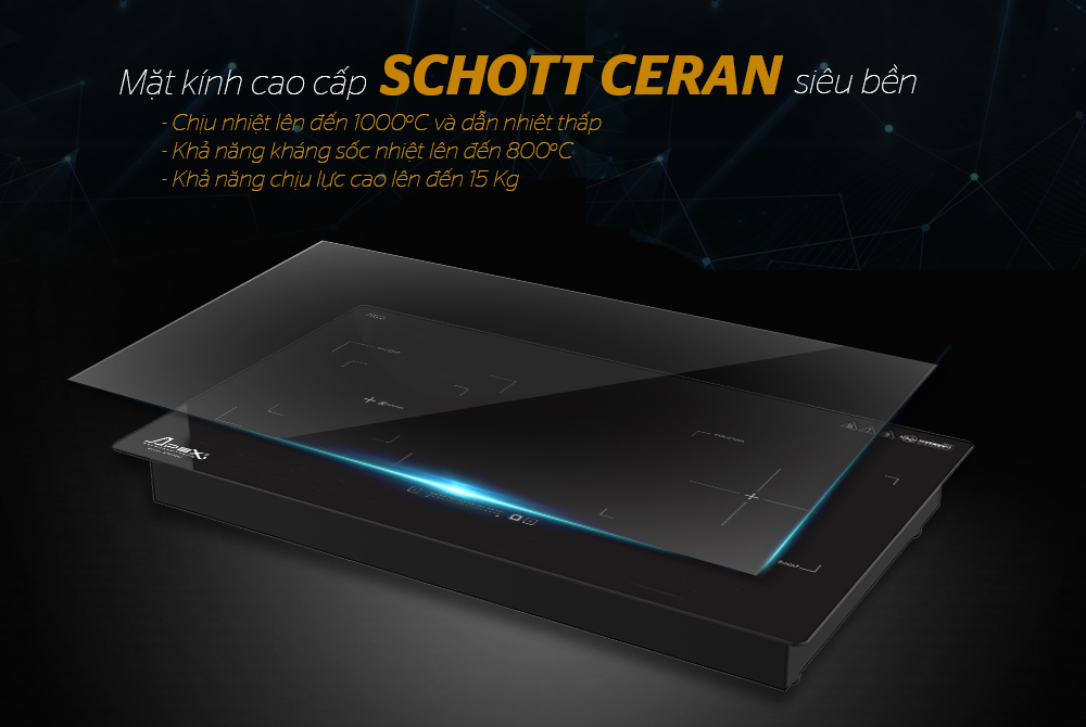 • Mặt kính Schott Ceran (Đức) siêu bền, chống sốc nhiệt tới 800oC