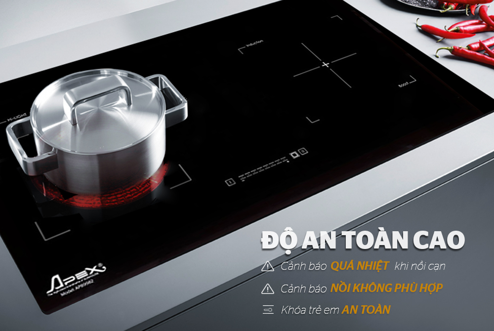 Bếp đôi điện từ hồng ngoại Apex APB9982 là một trong những sản phẩm cao cấp của CHÍNH HÃNG SUNHOUSE. Sản phẩm sử dụng mặt kính Schott Ceran (Đức) siêu bền, có khả năng chịu nhiệt, chịu lực và chống sốc nhiệt tới 800oC. Bếp có thiết kế sang trọng cùng những chức năng hiện đại và chất lượng vượt trội, góp phần tạo nên sự tiện nghi cho căn bếp của bạn. Không chỉ vậy, APB9982 còn giúp bạn nấu nướng thuận tiện và nhanh chóng, tiết kiệm tối đa điện năng và thời gian.