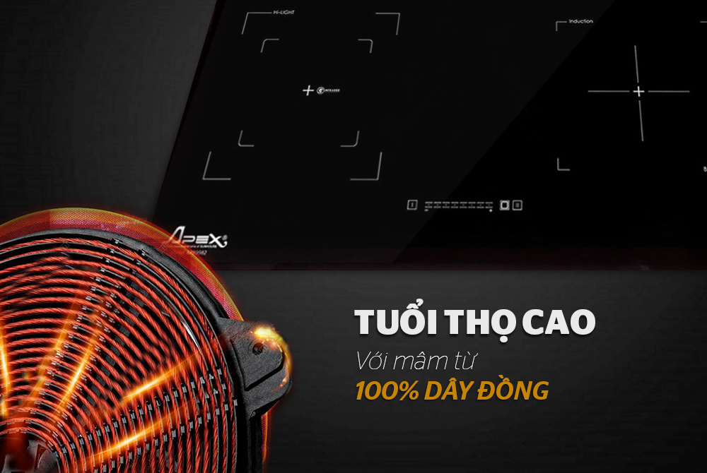 Bếp đôi điện từ hồng ngoại Apex APB9982 với mâm từ được làm bằng 100% dây đồng siêu bền, giúp truyền nhiệt tốt và tăng tuổi thọ của bếp.