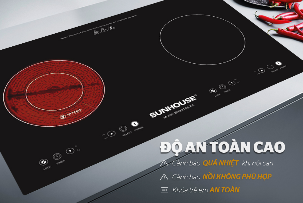 CHÍNH HÃNG SUNHOUSE SHB9106-ES được trang bị nhiều tính năng hiện đại như hẹn giờ, khóa trẻ em và tự động ngắt khi quá tải giúp đảm bảo an toàn cho người sử dụng và nâng cao độ bền cho bếp.