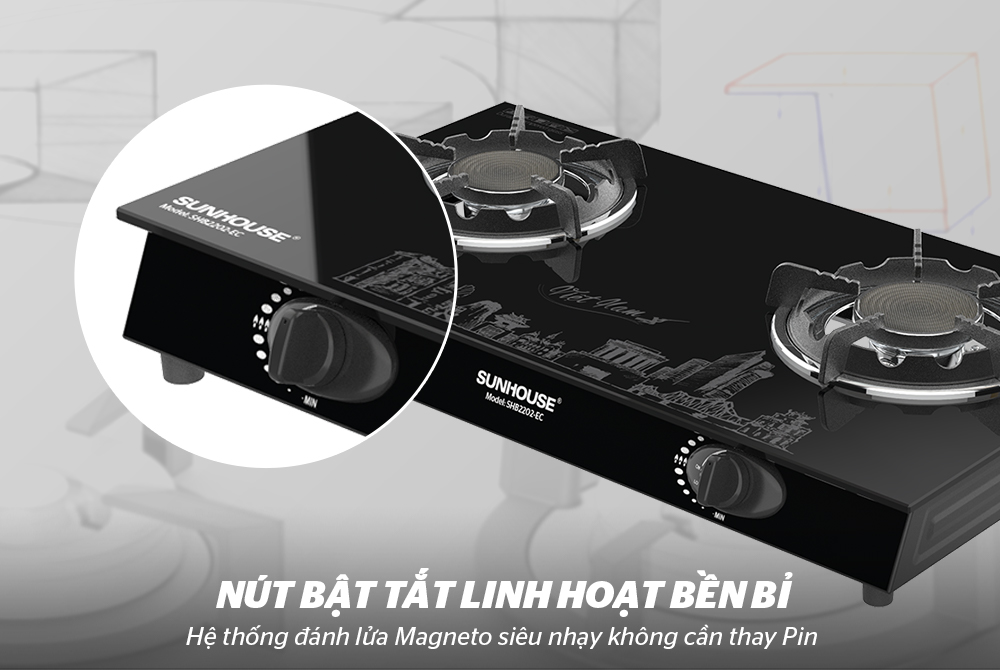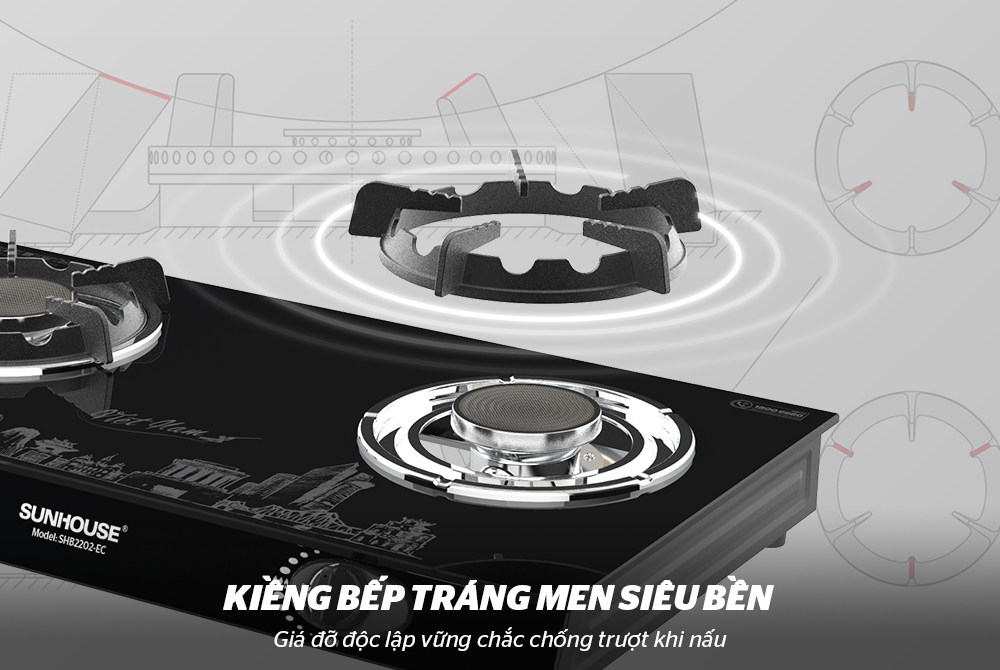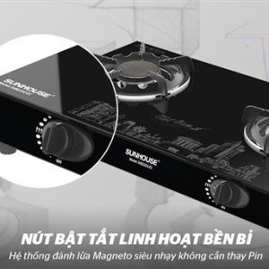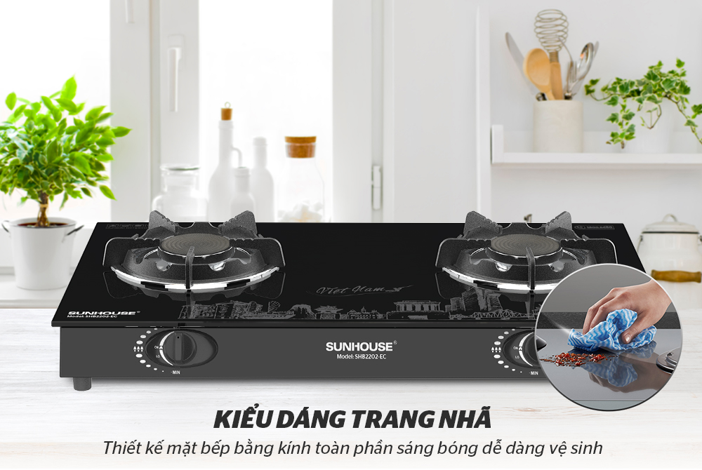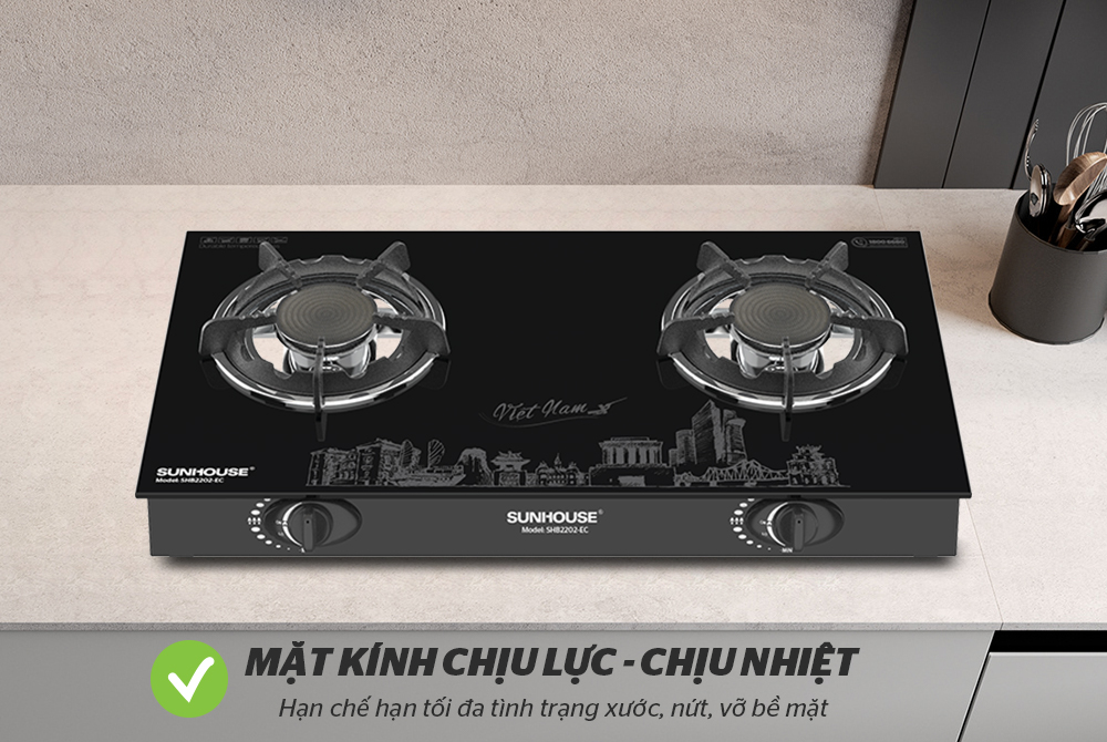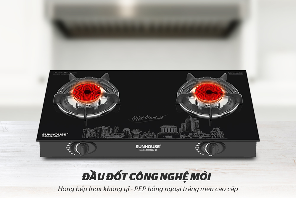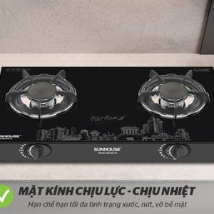 Bếp gas dương hồng ngoại CHÍNH HÃNG SUNHOUSE SHB2202-EC có 2 lò đun, điều khiển lửa to nhỏ bằng núm vặn tiện lợi, chế biến được nhiều món ăn cùng lúc. Mặt kính với gam màu đen cùng họa tiết các địa danh nổi tiếng của Việt Nam, vừa mang lại sự độc đáo, mới lại, tính thẩm mỹ cao vừa có khả năng chịu lực, chịu nhiệt, đồng thời dễ dàng vệ sinh sau khi sử dụng.