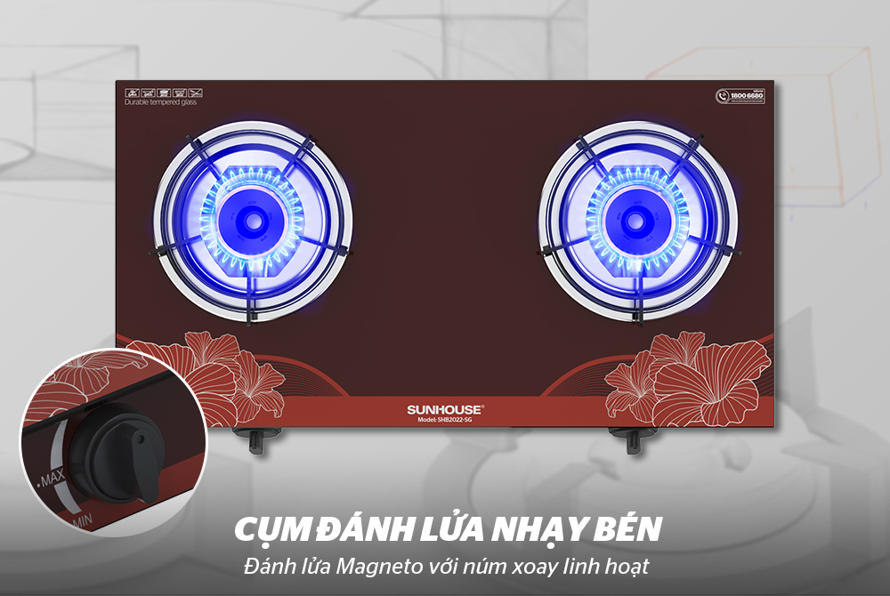 Bếp gas dương kính CHÍNH HÃNG SUNHOUSE – SHB2022-SG sử dụng hệ thống đánh lửa Magneto (hệ thống đánh lửa cơ), hoạt động dựa trên nguyên lí sử dụng 2 đá lửa đập vào nhau tạo ra ngọn lửa đều và xanh. Hệ thống đánh lửa Magneto điều khiển bằng núm vặn linh hoạt, bền bỉ, ít hỏng hóc, tiện lợi hơn so với hệ thống IC.