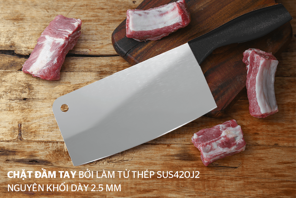 - Dao chặt đầm tay bởi làm từ thép SUS420J2 nguyên khối dày 2.5 mm