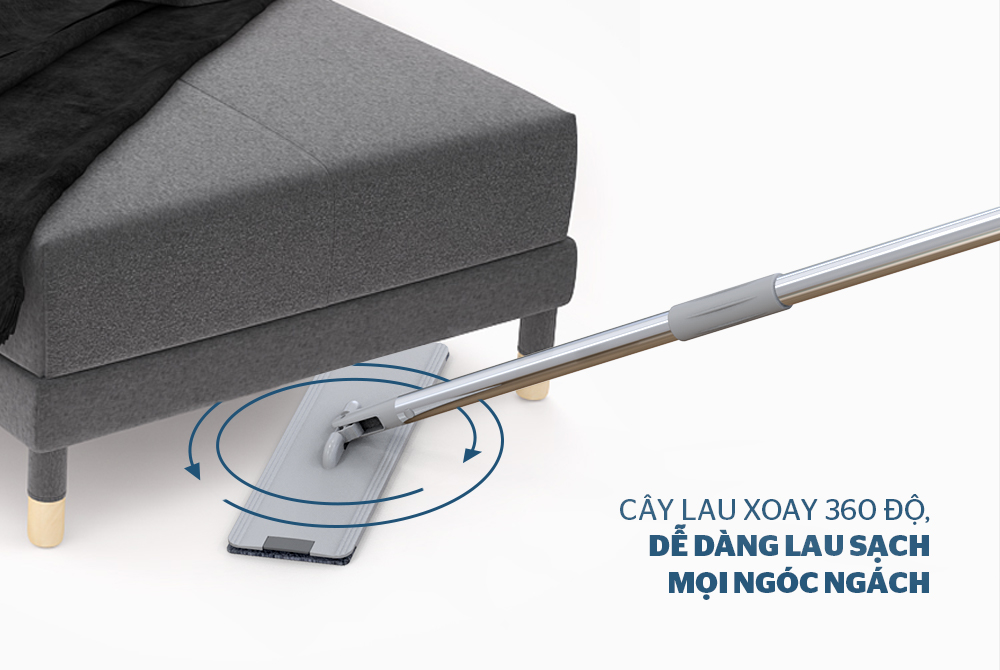 Thiết kế đầu cây lau thông minh có thể xoay góc 360 độ, nhờ vậy bạn có thể đưa đầu lau xoay dễ dàng theo góc tường, lau sâu vào trong gầm bàn, ghế, giường, tủ…mà không cần phải tốn sức.
