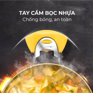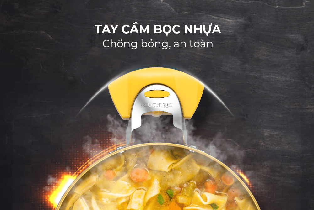 Tay cầm và núm nắp vung được bọc nhựa cách nhiệt, giúp chống bỏng, an toàn cho người dùng trong quá trình nấu nướng, đồng thời giúp người dùng dễ dàng thao tác khi nấu ở nhiệt độ cao.