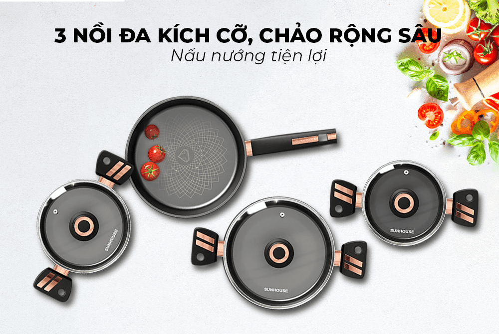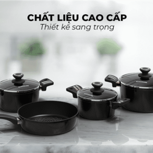 Bộ nồi chảo chống dính Ultra Titanium CHÍNH HÃNG SUNHOUSE ST2204B bao gồm 4 sản phẩm: 3 chiếc nồi đa kích cỡ cùng 1 chảo rộng sâu, phục vụ cho nhu cầu nấu nướng đa dạng của mọi gia đình.