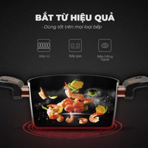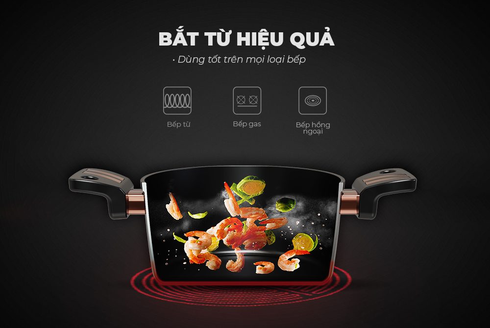 Đáy nồi có khả năng bắt từ, bắt nhiệt tốt, có thể sử đụng được trên mọi loại bếp khác nhau như bếp từ, bếp gas hay bếp hồng ngoại.