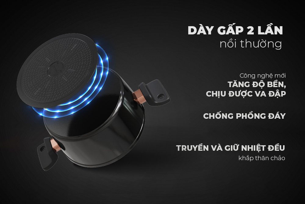 Nồi và chảo có độ dày gấp 2 lần các sản phẩm nhôm thông thường cho khả năng chống va đập cực tốt, không phồng đáy sau thời gian dài sử dụng ở nhiệt độ cao.