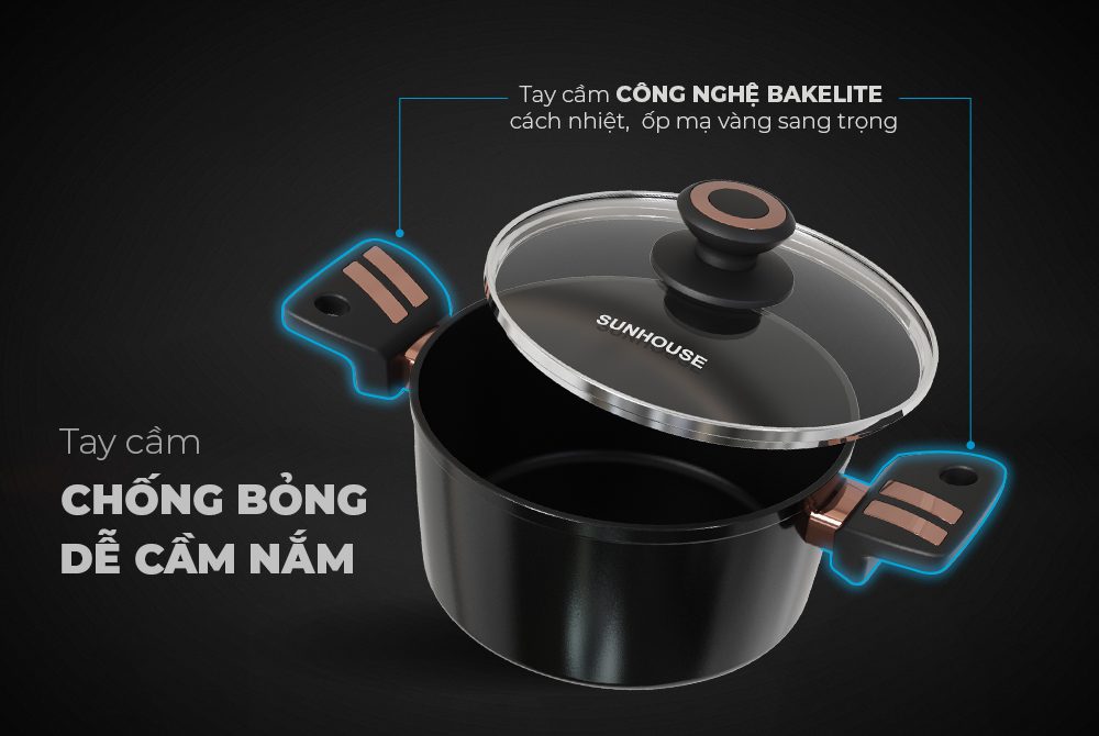 Tay cầm làm từ nhựa bakelite, phủ một lớp silicon chắc chắn giúp chống bỏng, chống trơn trượt, an toàn và thuận tiện cho việc thao tác trong quá trình nấu nướng.