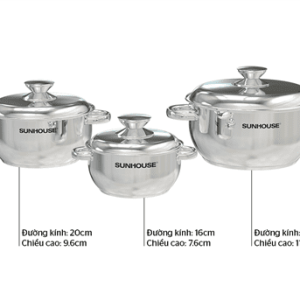 Bộ nồi inox 3 đáy CHÍNH HÃNG SUNHOUSE SHG339 sử dụng được với mọi loại bếp, kể cả bếp từ. Bộ sản phẩm gồm 3 nồi với đường kính 16 – 20 – 24 cm phù hợp với nhu cầu nấu nướng của mọi gia đình. Nồi nhỏ 16cm thích hợp để luộc trứng, kho thịt, trong khi nồi cỡ trung 20 cm có thể nấu canh cho 2 – 4 người còn nồi lớn 24cm có thể luộc gà, nấu canh hoặc lẩu cho 3 – 5 người.