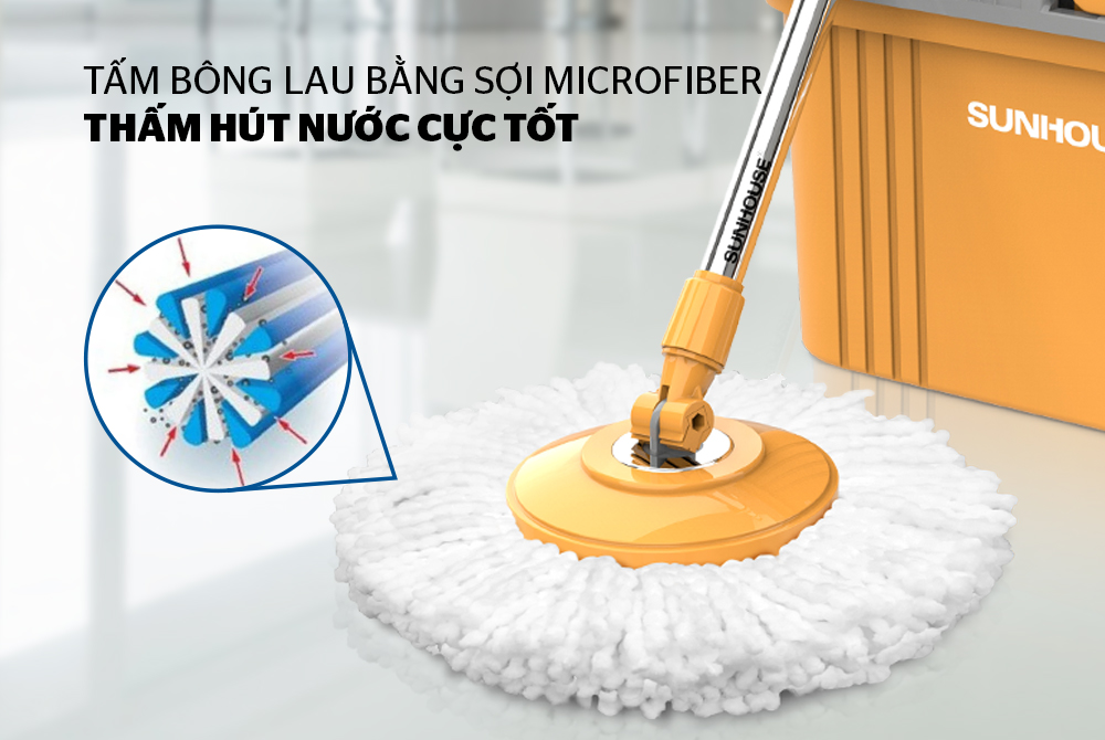 Bông lau nhà Microfiber xoay 360 độ CHÍNH HÃNG SUNHOUSE KS-CO350M chất liệu sợi Microfiber cao cấp có khả năng thấm nước cao gấp 7 lần và nhanh khô hơn gấp 3 lần so với các loại bông lau thông thường khác, làm tăng độ bền nên sẽ tiết kiệm hơn. Sản phẩm được sản xuất ở Việt Nam nên không chứa các chất độc hại, an toàn với môi trường. Ngoài ra, sợi microfiber siêu thấm hút giúp không để lại vệt nước khi lau, giúp bề mặt sạch bóng.