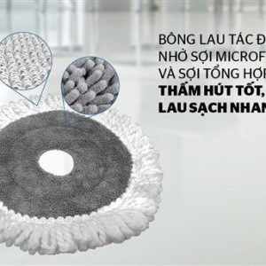 Kết hợp sợi tổng hợp cao cấp và sợi Microfiber mang đến thiết kế đan chéo lập thể siêu nhỏ giúp thấm hút nước tốt, vắt khô nhanh gấp nhiều lần so với các loại khăn lau thông thường, có tác dụng lau sạch bụi bẩn nhanh chóng nhất. Hệ thống vắt nước tích hợp gọn và tiện lợi, dễ dàng giặt và vắt khô bông lau. Đặc biệt, vì bông lau được làm từ 2 sợi cao cấp nên có ưu điểm là không bị xơ cứng nên không làm trầy xước bề mặt được lau.