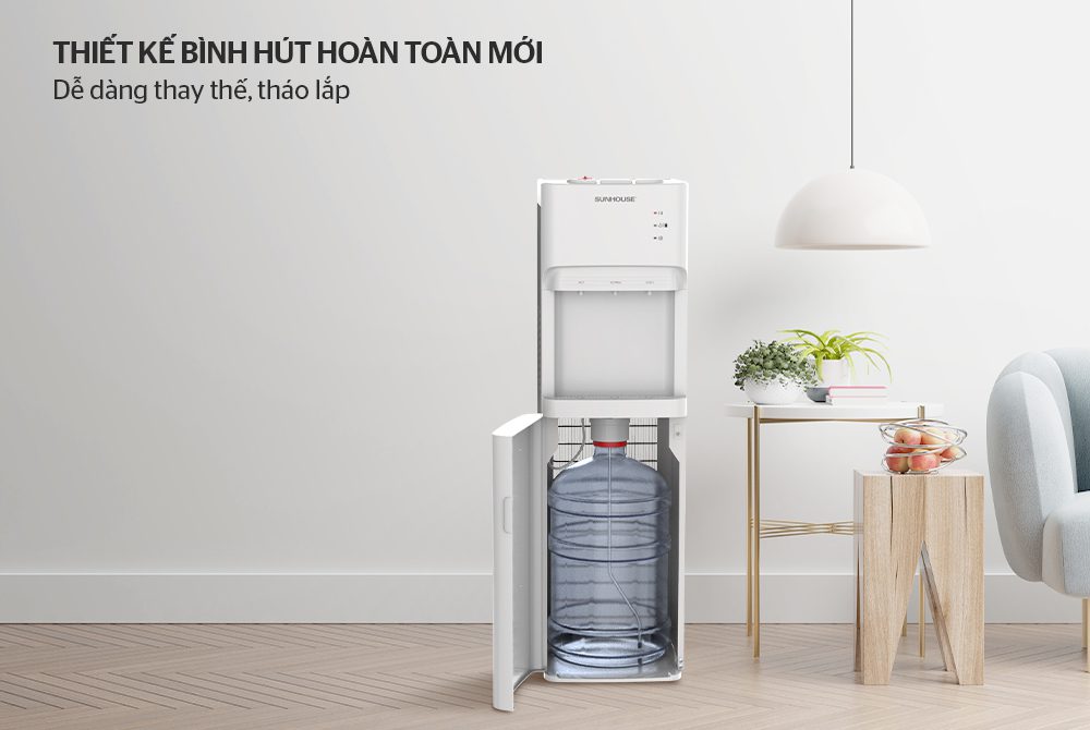 Đặc biệt so với các cây nước thông thường, CHÍNH HÃNG SUNHOUSE cho ra mắt cây nước đầu tiên sử dụng công nghệ bình hút hiện đại, cho phép lắp đặt bình nước vào máy dễ dàng hơn.