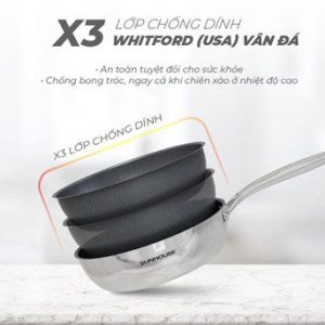 Lòng chảo phủ chống dính Whitford (USA) vân đá tinh tế, chống bám dính tối ưu, chống bám bụi và hạn chế trầy xước. Dòng chảo Inox đa lớp bao gồm các size 20 – 22 – 24 cm để bạn thoải mái lựa chọn theo nhu cầu nấu ăn trong gia đình hoặc nhà hàng.
