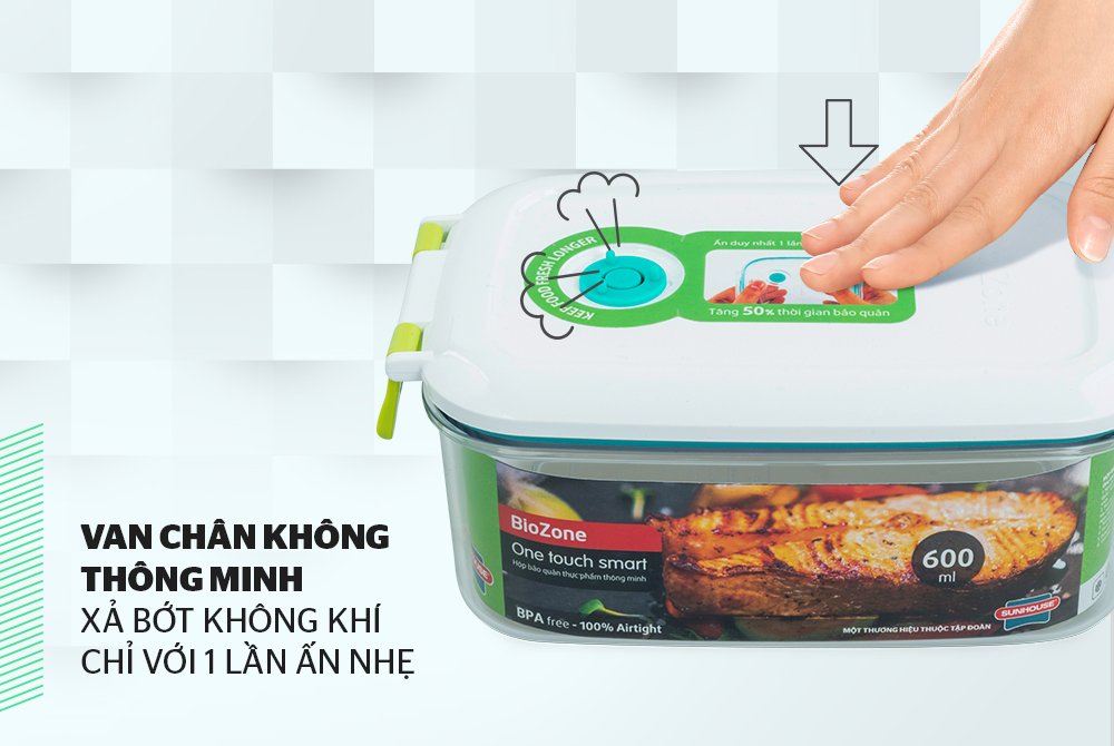 Nhờ thiết kế van chân không thông minh và độ kín hơi 100%, hộp BioZone giúp bạn giữ nguyên độ tươi ngon và tăng 50% thời gian bảo quản thực phẩm.