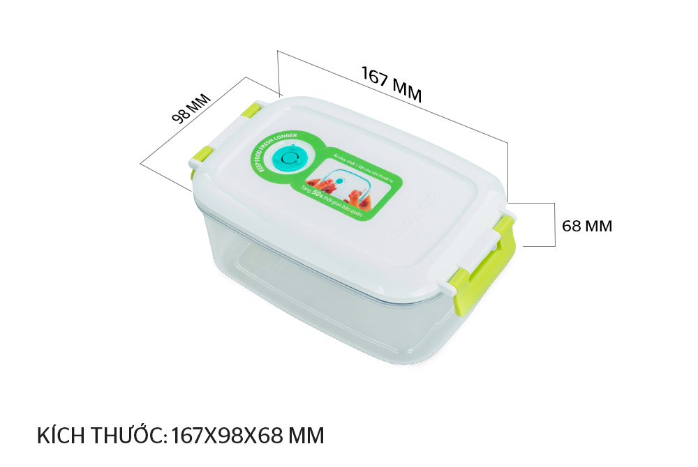 Van silicone trên nắp hộp có tác dụng xả bớt không khí trong hộp chỉ với một lần ấn nhẹ, giúp giảm độ ẩm và tốc độ oxi hóa, ngăn ngừa thất thoát vitamin, giữ nguyên độ tươi ngon của thực phẩm.