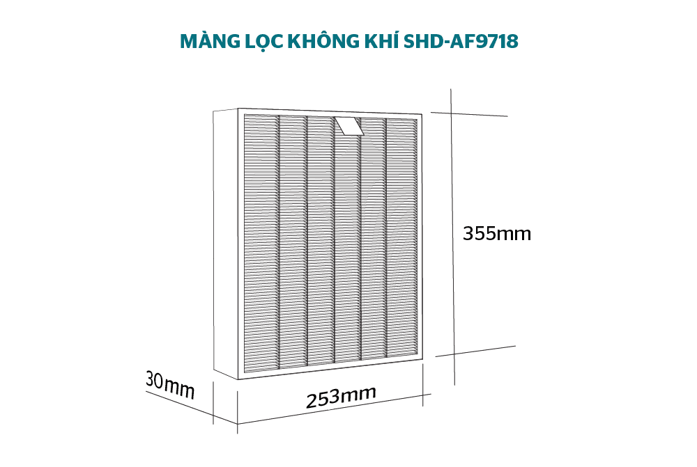 3 màng lọc với kích thước 355x253x30 mm, màng lọc không khí CHÍNH HÃNG SUNHOUSE SHD-AP9718 phù hợp với sản phẩm máy lọc không khí CHÍNH HÃNG SUNHOUSE SHD-20AP9718.