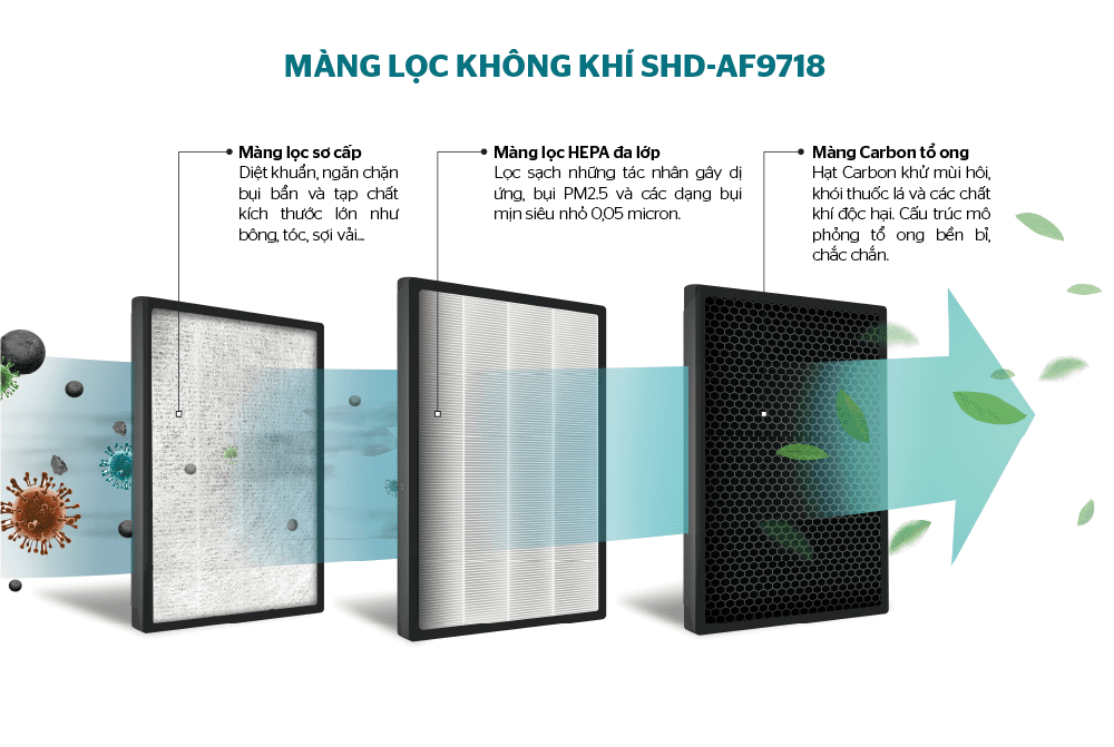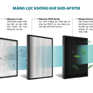 Màng lọc không khí CHÍNH HÃNG SUNHOUSE SHD-AP9718 sử dụng kết hợp giữa hệ thống màng lọc 3 lớp cao cấp gồm màng lọc sơ cấp, màng lọc carbon và màng lọc HEPA giúp tăng cường hiệu quả lọc. Nhờ thế mà đảm bảo lọc sạch được bụi bẩn, khói mùi, các tác nhân gây dị ứng và ngay cả bụi mịn PM2.5 trong nhà.