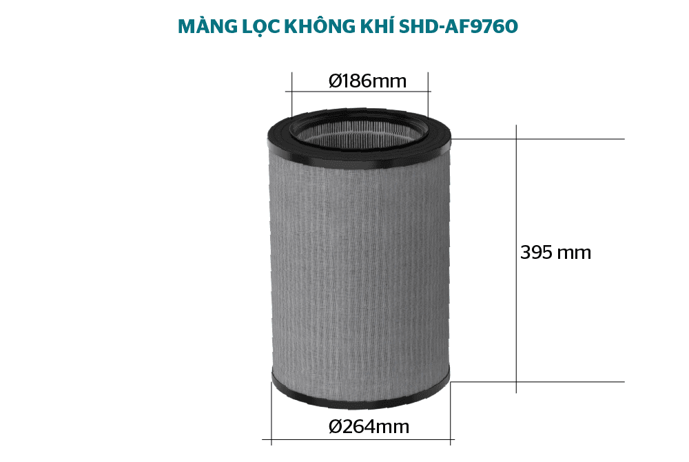 3 màng lọc với kích thước Ø264xØ186×395 mm, màng lọc không khí CHÍNH HÃNG SUNHOUSE SHD-AP9760 phù hợp với sản phẩm máy lọc không khí CHÍNH HÃNG SUNHOUSE SHD-60AP9760.
