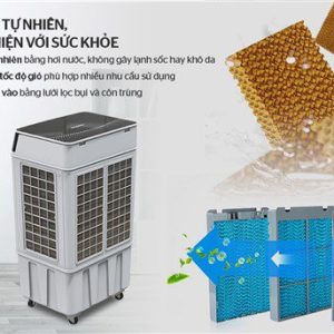 Luồng không khí cũng được lọc sạch qua 2 lớp: lưới lọc bụi bên ngoài và tấm làm mát phía trong. Cơ chế là lưới lọc bụi sẽ giữ lại các bụi lớn và tấm làm mát khi đang ướt nước sẽ giữ lại các hạt bụi cỡ nhỏ hơn (vì thế nên bạn phải thường xuyên vệ sinh 2 bộ phận này).