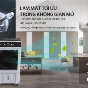 Sản phẩm cho lưu lượng gió lên đến 4.000m3/giờ, kết hợp chức năng đảo gió tự động (trái – phải), cho phép mở rộng phạm vi làm mát lên đến 45m2. Những diện tích phù hợp sử dụng sản phẩm là nhà hàng, quán ăn, quán café…