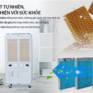 Luồng không khí cũng được lọc sạch qua 2 lớp: lưới lọc bụi bên ngoài và tấm làm mát phía trong. Cơ chế là lưới lọc bụi sẽ giữ lại các bụi lớn và tấm làm mát khi đang ướt nước sẽ giữ lại các hạt bụi cỡ nhỏ hơn (vì thế nên bạn phải thường xuyên vệ sinh 2 bộ phận này).