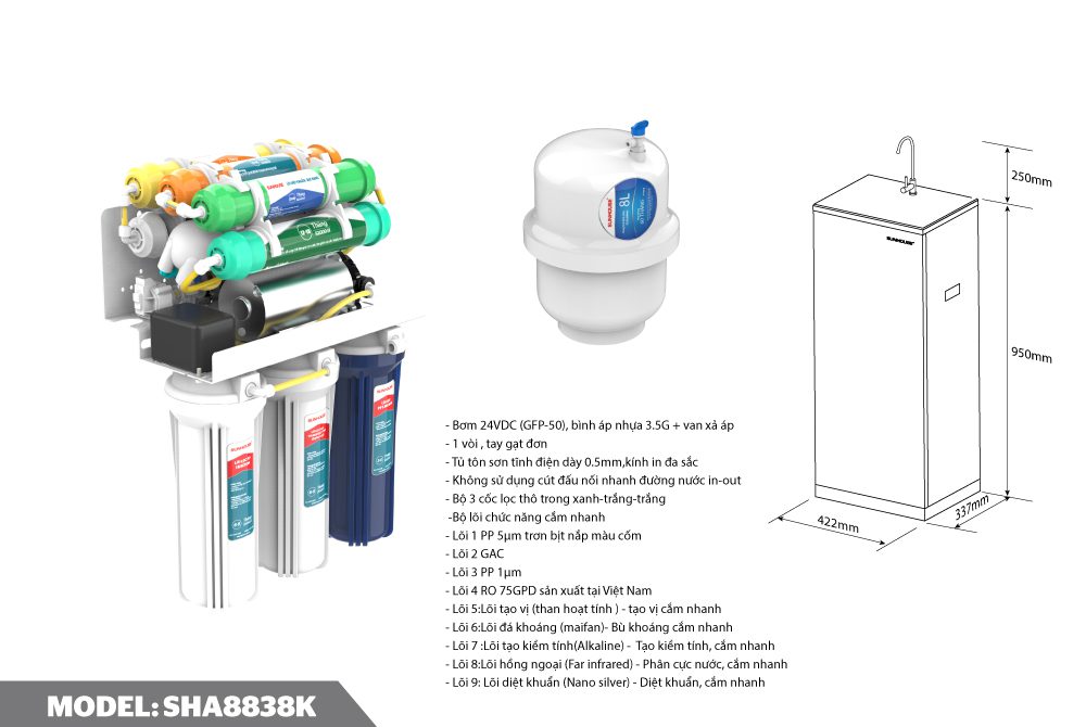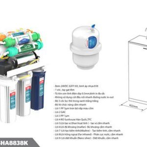SHA8838K được trang bị van điện từ và hệ thống tự động kiểm soát hoạt động hiện đại cùng với công nghệ diệt khuẩn tiên tiến hàng đầu NANO SILVER và màng R.O Sunhouse cao cấp.