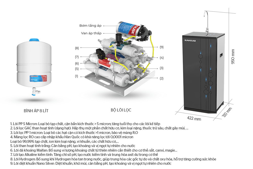 MÁY LỌC NƯỚC R.O Stech 9 LÕI CHÍNH HÃNG SUNHOUSE SHA8849K