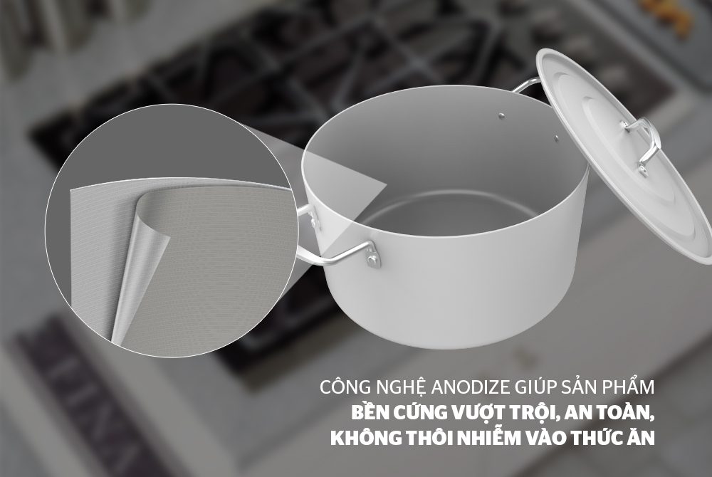 Nồi Anod được sản xuất trên dây chuyền công nghệ tráng nhôm hiện đại, gia công chất lượng nên có bề mặt trơn nhẵn, sáng bóng, dễ lau chùi. Công nghệ Anodized còn giúp sản phẩm không bị rỗ bề mặt khi đựng các thức ăn nóng, chua như nồi nhôm thông thường.