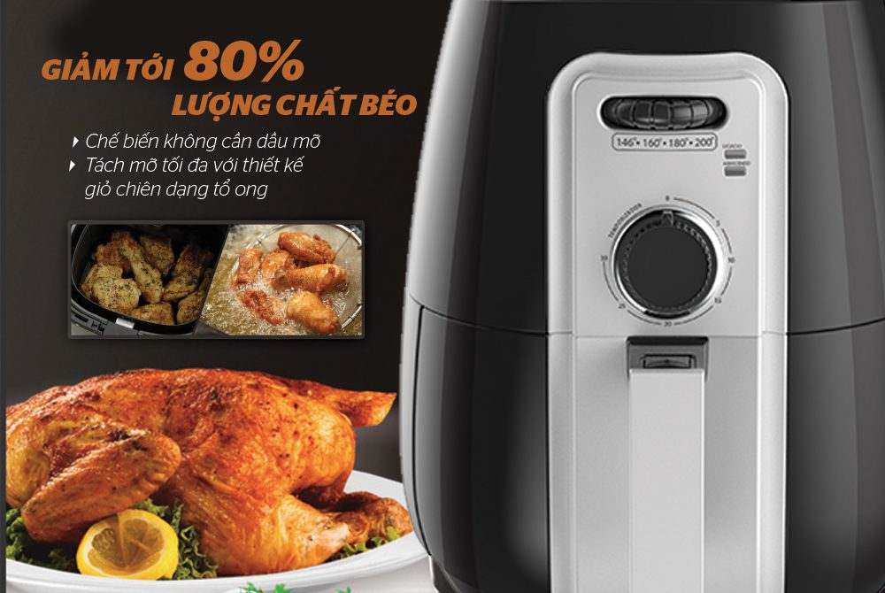 Thực phẩm chiên không những không cần dùng đến dầu mỡ mà lượng mỡ thừa từ thực phẩm còn được tự động tách ra và chảy xuống khay hứng ở phía dưới, giúp giảm đến 80% lượng mỡ thừa. Món chiên tuy đã tách béo nhưng không hề khô mà vẫn giữ được sự mềm dai.