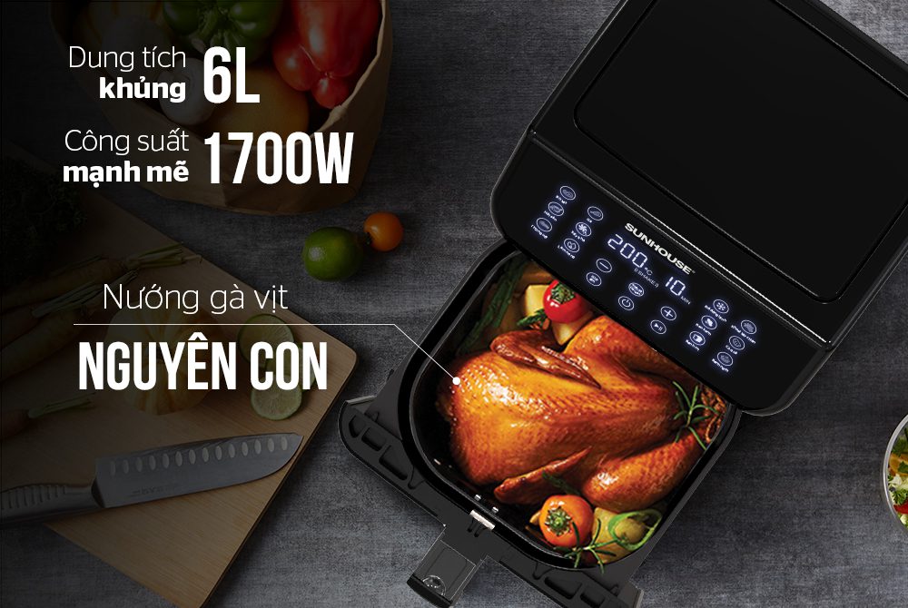 Nồi chiên không dầu CHÍNH HÃNG SUNHOUSE SHD4087 sở hữu dung tích lớn 6L cùng công suất 1700W giúp chiên nướng lượng lớn thức ăn một cách nhanh chóng. Dung tích lớn thích hợp cho những thức ăn lớn, gà vịt nguyên con mà không cần chặt nhỏ, chiên lượng lớn thức ăn không cần chia nhiều mẻ chiên, giúp tiết kiệm thời gian công sức mà thức ăn vẫn chín đều, đẹp mắt.