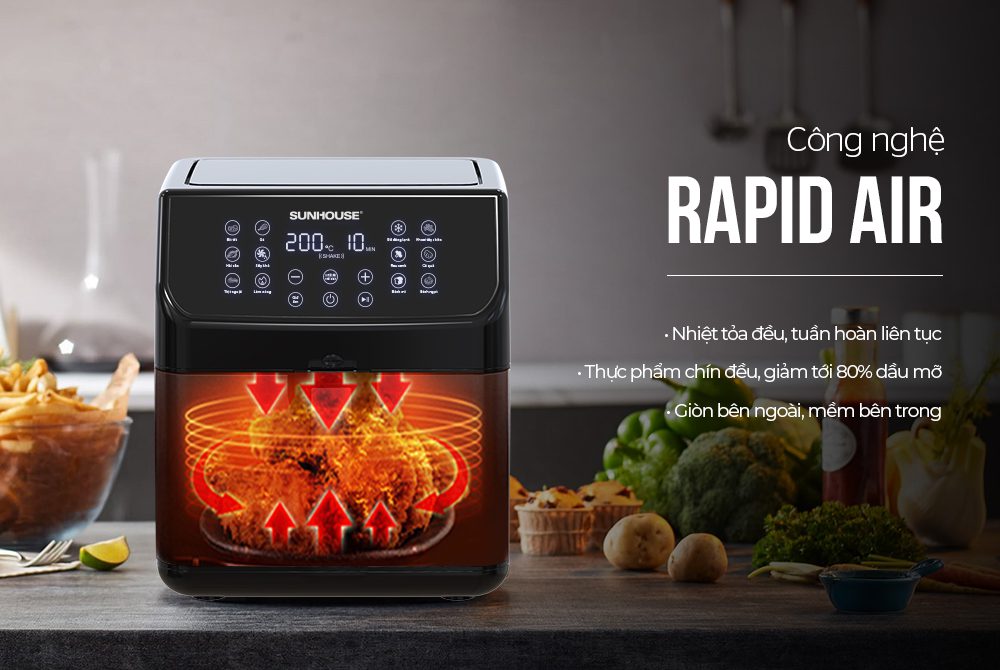 Rapid Air (lưu thông không khí tốc độ cao) là công nghệ tiên tiến, lưu thông tuần hoàn khí nóng (từ sợi đốt maiso phía trên) cho phép thực phẩm chín nhanh hơn, ngon hơn mà lại bảo vệ sức khỏe. Nguyên liệu được đun nóng từ nhiều phía cùng một lúc và không cần phải thêm dầu mỡ mà vẫn chín đều, ngon miệng.