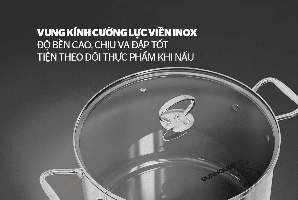Nồi inox 1 lớp đáy CHÍNH HÃNG SUNHOUSE SHG115-30 được trang bị vung kính trong suốt, giúp bạn dễ dàng quan sát thực phẩm bên trong. Đặc biệt, vung được bo viền inox tăng khả năng chịu lực, hạn chế vỡ trong quá trình sử dụng.