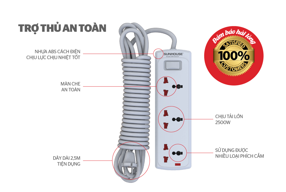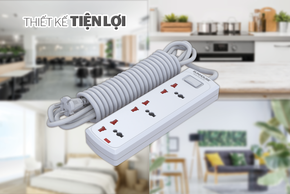 - Ổ cắm điện CHÍNH HÃNG SUNHOUSE SHE-OC6-3P thiết kế nhỏ gọn gồm 3 ổ cắm 3 chấu, ngoài ra chiều dài dây lên đến 2,5m giúp dễ dàng sử dụng ở những không gian rộng và sử dụng cho nhiều thiết bị cùng lúc.
