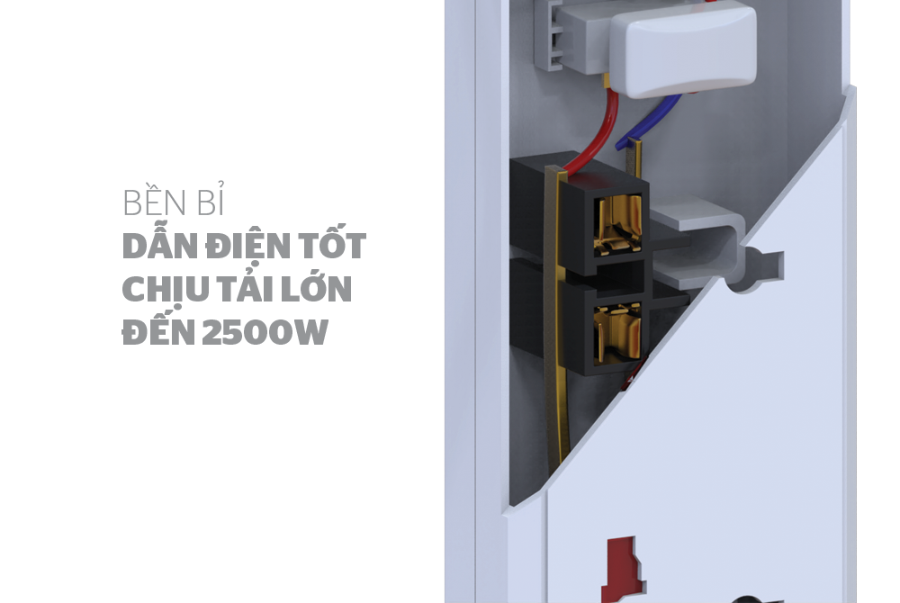 - Ổ cắm điện CHÍNH HÃNG SUNHOUSE SHE-OC6-3P có công suất lớn lên đến 2500W, cho khả năng chịu tải lớn, giúp bạn có thể cắm nhiều thiết bị cùng lúc mà không lo bị quá tải.