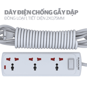 - Ngoài ra, dây điện của Ổ cắm điện CHÍNH HÃNG SUNHOUSE SHE-OC6-3P được làm bằng đồng loại 1 với thiết kế tiết diện 2×0,75 giúp dẫn điện và chống gãy gập tốt hơn so với các loại ổ cắm thông thường.