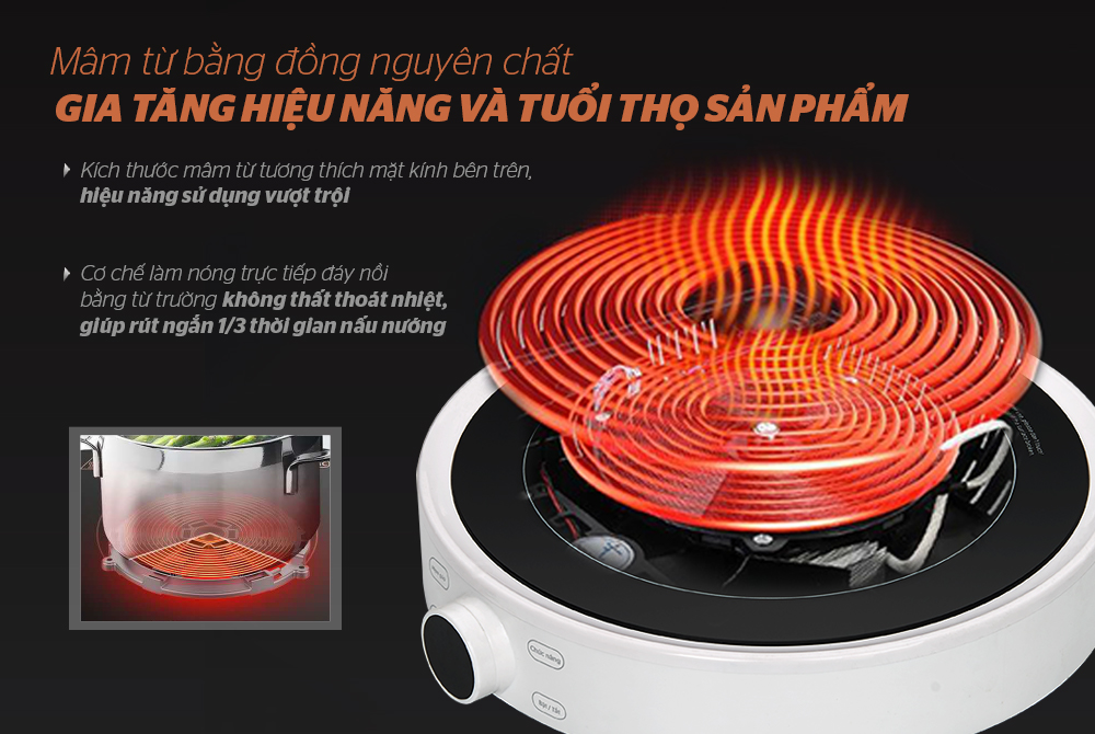 Đặc biệt, bếp điện từ cảm ứng SHD6872 còn sở hữu thiết kế mâm nhiệt làm từ đồng nguyên chất giúp quá trình gia nhiệt diễn ra nhanh hơn. Cơ chế làm nóng trực tiếp đáy nồi bằng từ trường và nhiệt năng chỉ tập trung vào vùng cần nấu chín giúp thực phẩm chín nhanh, rút ngắn thời gian nấu nướng chỉ bằng 1/3.